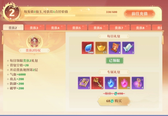 每充值1仙玉可以增加1点贵族经验值,达到对应等级可以领取礼包。