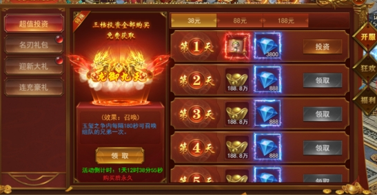购买投资7天内每日都可领取奖励,3档投资全部购买还可以赠送超强攻城称号!
