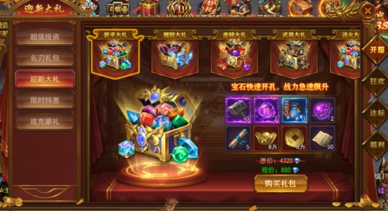 众多礼包助力提升,新手大礼、翅膀大礼、坐骑大礼、武将大礼、淬火大礼、宝石大礼等。