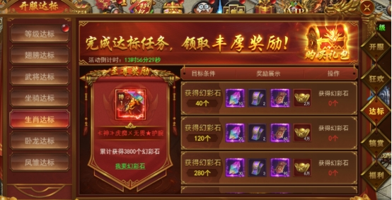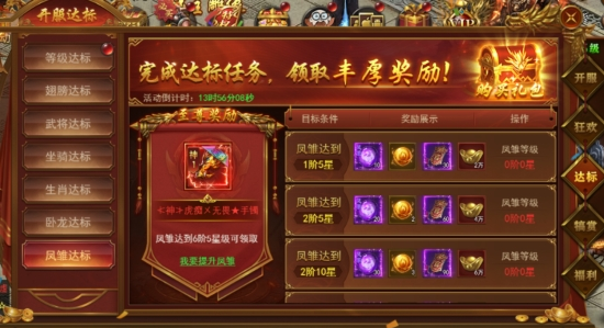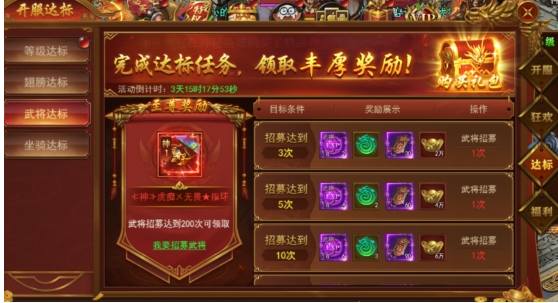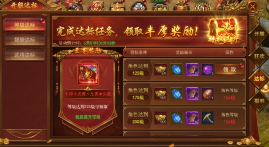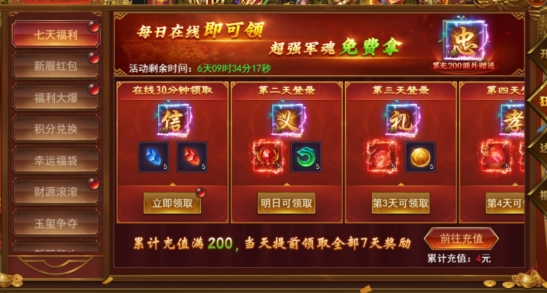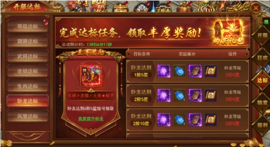 新服前6天每天开启不同的达标活动,活动持续6天,完成达标即可领取丰厚奖励。