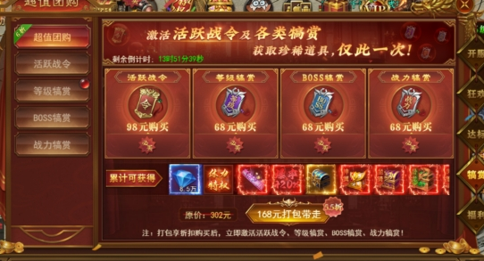 打包享受折扣购买,立即激活活跃战令、等级犒赏、BOSS犒赏、战力犒赏。