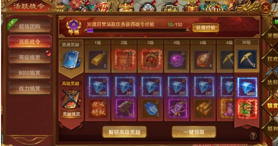 完成日常活跃获得战令经验,提升战令等级获得奖励