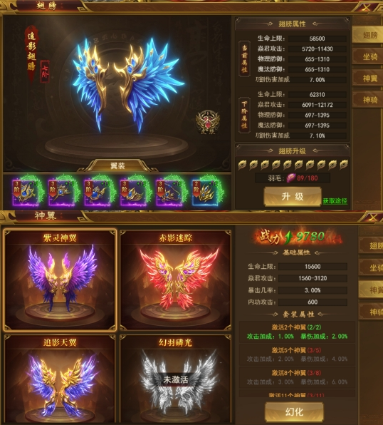 3、激活更多的神翼可以获得属性加成,并可随意幻化