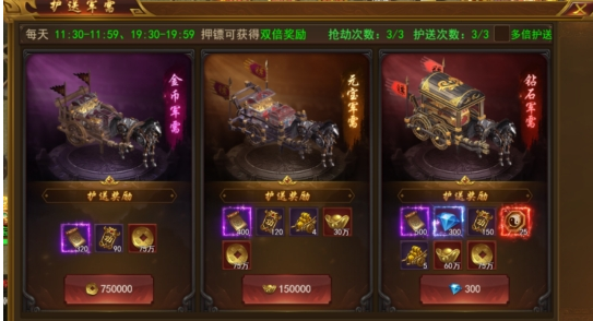 2. 玩家可花费金币/元宝/钻石选择镖车档次,档次越高,押镖完成的奖励越高。