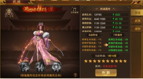 1、将魂的属性和战力为所有武将属性总和,可以使用任意已激活的武将外观