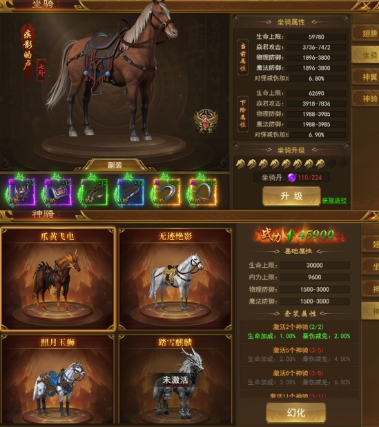 1、可通过坐骑丹升级坐骑,提升等级有更多属性加成