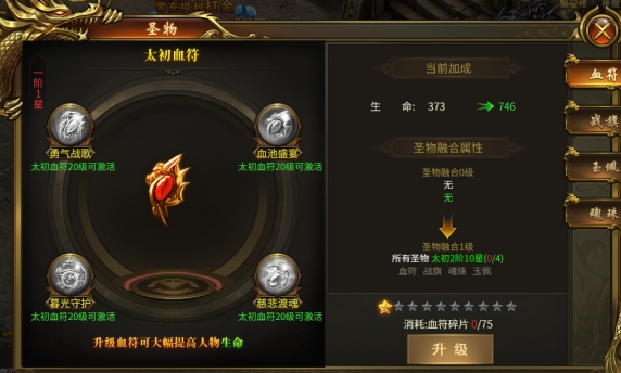 3、需要收集对应的圣物碎片进行升级,可以提升人物属性,四种圣物属性分别为生命、攻