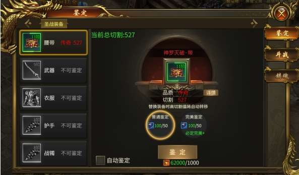 2、可分为普通和完美鉴定,需要消耗鉴定石以及元宝或者钻石。