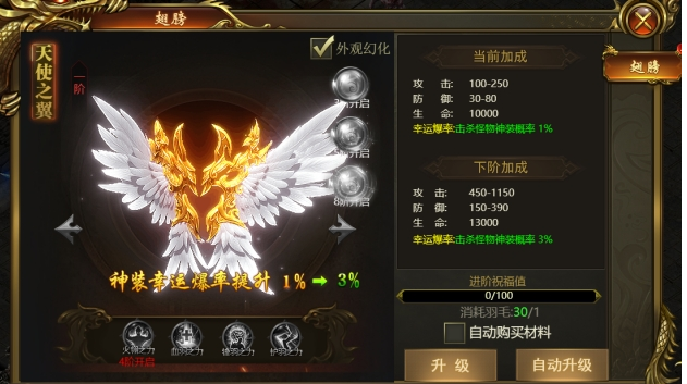 2、消耗羽毛升级翅膀可以提升属性,同时提升神装幸运爆率提升