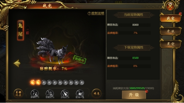 2、消耗元宝可以对宠物进行升级可以提升属性,