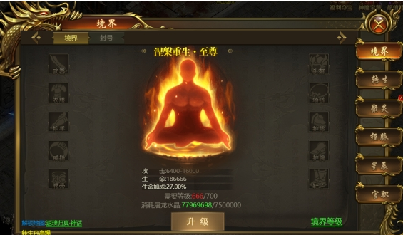 1、境界:共有18个境界等级,境界升级需要对应等级条件和屠龙水晶,可以提升大量属性,同时可以穿戴各项装备。