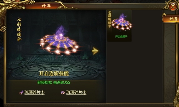 2、激活神器七彩琉璃伞开启连斩功能,开服第三天开启神装功能,转生5转开启传世装备功能。
