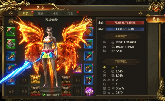 4、连斩可以激活四种技能,激活各项属性功能。神装穿戴套装装备后可以激活套装属性,属性得到大幅度的提升。
