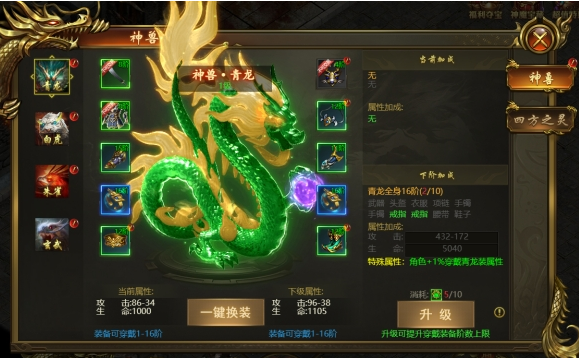 消耗指定道具可以对神兽进行升级可以提高属性,同时也可以穿戴装备。