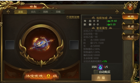 2、分别消耗法宝精华/玄兵精华/图腾精华/龙魄精华对四相进行升级,升级可以提升属性。