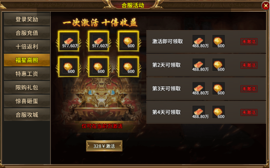 一、合服活动(开服第三天下午14:00合服,开启合服活动)