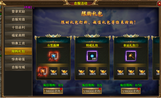 4. 限时礼包:前三个礼包可以使用灵符购买(必买),每天可以在这用灵符买50柄锤子!
