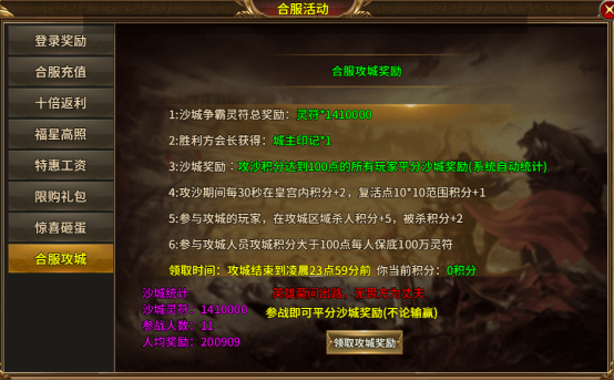 5. 每晚八点合服攻城必参加,只要100积分 就可以保底获得1000000w灵符
