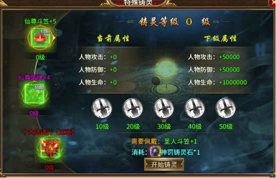 5. 特殊注灵:消耗神罚铸灵石铸灵,达到一定等级可提升角色百分百攻、血!(铸灵石是万宝楼获得)